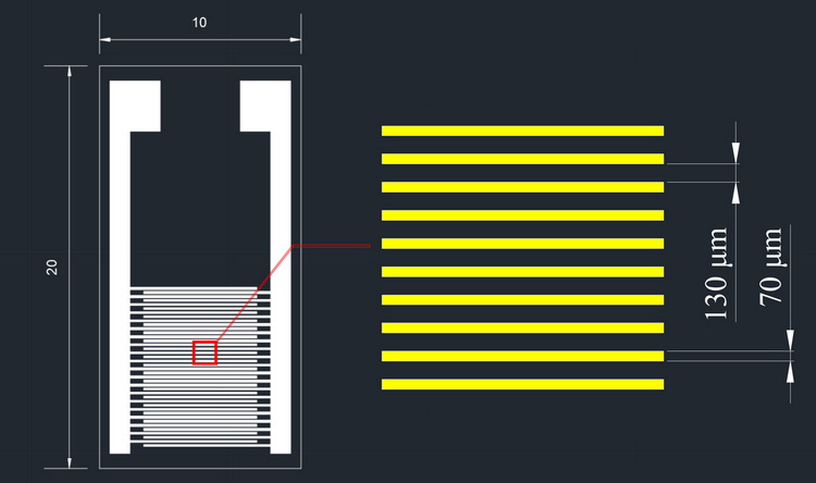 1、基材:氧化鋁陶瓷;外形尺寸:20mm*10mm。2、指寬:7oum,指間距:130um,指長:6.3mm。叉指對數: 20對(40指)。