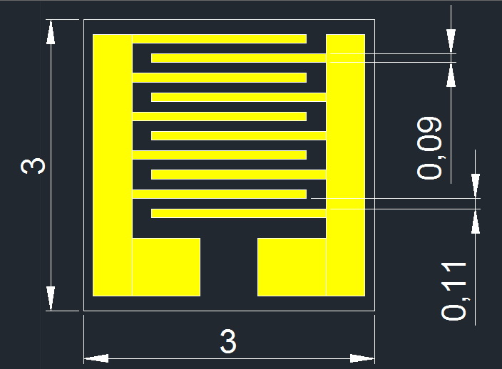 1.基材:聚對苯二甲酸乙二醇酯(PET),厚度75um,外形尺寸3mm*3mm。2.線寬90um,線距110um,指長1.8mm;叉指對數(shù):5對(10指)。3.金屬層結(jié)構(gòu) Cu/Ni/Au,厚度分別為12um,1um,1um。