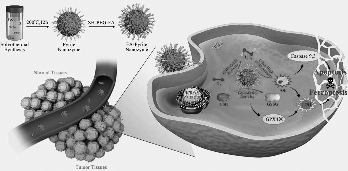 產(chǎn)品性能:高活性的硫鐵礦納米酶克服了傳統(tǒng)過氧化物納米酶對H2O2親和力低的問題,能夠催化腫瘤部位有限的H2O2產(chǎn)生大量的羥基自由基。同時,硫鐵礦納米酶的新活性——谷胱甘肽氧化酶活性的發(fā)現(xiàn),不僅能為其過氧化物酶活性的發(fā)揮提供底物H2O2,而且能催化氧化谷胱甘肽,引起細胞鐵死亡,從而實現(xiàn)腫瘤的凋亡-鐵死亡協(xié)同治療。重要的是,硫鐵礦納米酶無需其他任何幫助,單一材料即可實現(xiàn)高效、安全的腫瘤治療效果,表明它具有很大的臨床轉(zhuǎn)化潛力。