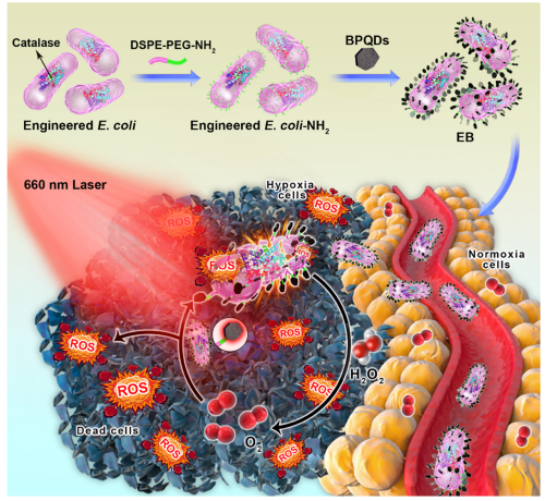 其他說明:密封狀態下保質期半年【主要優勢】靜脈注射后,EB能夠有效靶向腫瘤內缺氧區域。在激光照射下,生成ROS,破壞細菌膜,導致過氧化氫酶釋放。過氧化氫酶能夠催化過氧化氫降解生成氧氣,從而緩解缺氧。這種治療方式能夠有效地抑制腫瘤在體內和體外的生長。