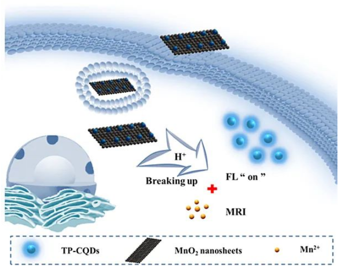 原料: 雙光子碳量子點(TP-CQDs)+MnO2納米片 激發/發射波長:392/439nm 應用:pH檢測和MRI檢測