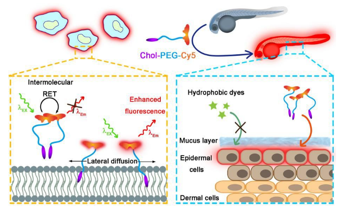 其他說明:密封狀態下保質期半年【主要優勢】由于在水溶液中Cy5分子之間容易形成二聚體的結構進而發生分子間共振能量轉移,該探針的熒光發射會在一定程度被淬滅;而當膽固醇分子錨定至細胞膜上時,細胞膜的流動性會驅使熒光探針發生側向擴散,從而打破了Cy5分子間的二聚體狀態并實現了熒光增強。