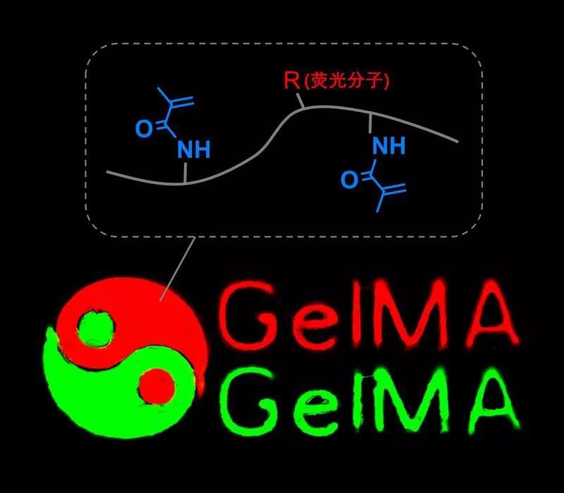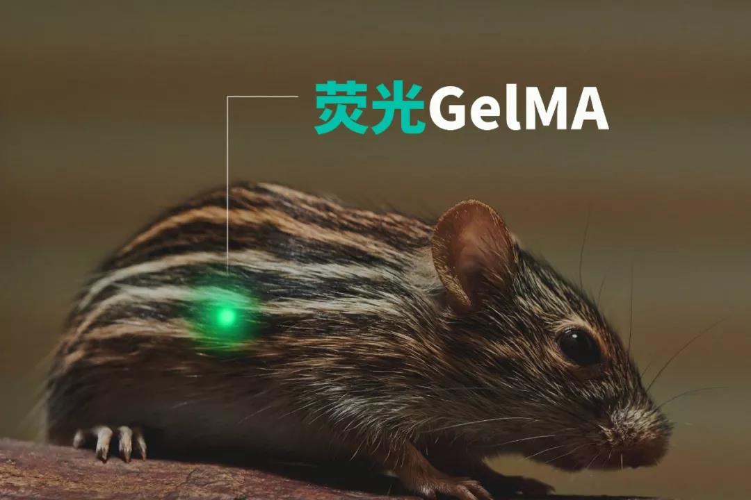 甲基丙烯酰化明膠(GelMA)為雙鍵改性明膠,其可通過紫外及藍光固化成膠。GelMA光固化水凝膠兼具天然和合成生物材料的特性,其具有適于細胞生長和分化的三維結構。熒光 GelMA是在GelMA分子上化學接枝熒光分子,通過改變熒光分子類型而使其具有特定的熒光顏色。此化學標記方法避免了物理混合或靜電吸附等方法中熒光分子容易擴散出體系的缺點,同時也避免了熒光微粒成像不均的缺點。該熒光GelMA具有良好生物相容性,在體內外成像、示蹤、材料降解、生物傳感及3D打印工藝等領域有廣闊的應用前景。