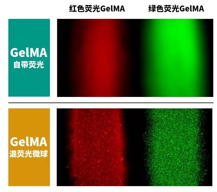 *注:在配制不同濃度熒光 GelMA 時,濃度越高,相應熒光強度越高,若要降低熒光強度,可將熒光 GelMA與普通 GelMA按一定比例混合使用。