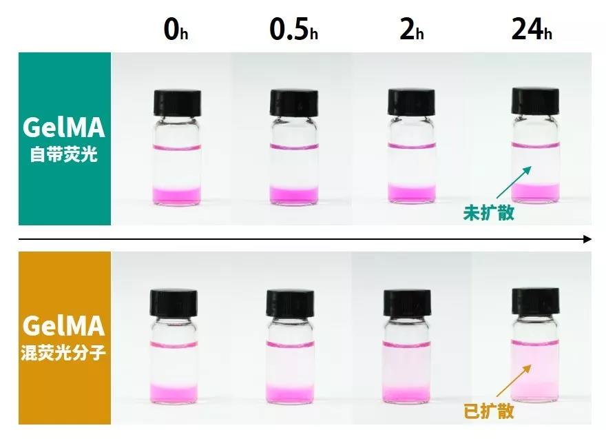 2.熒光GelMA穩定不擴散。下圖為自帶熒光和混熒光分子的兩種GelMA擴散對比。混熒光分子的GelMA容易擴散;自帶熒光GelMA能長時間保持熒光特性。