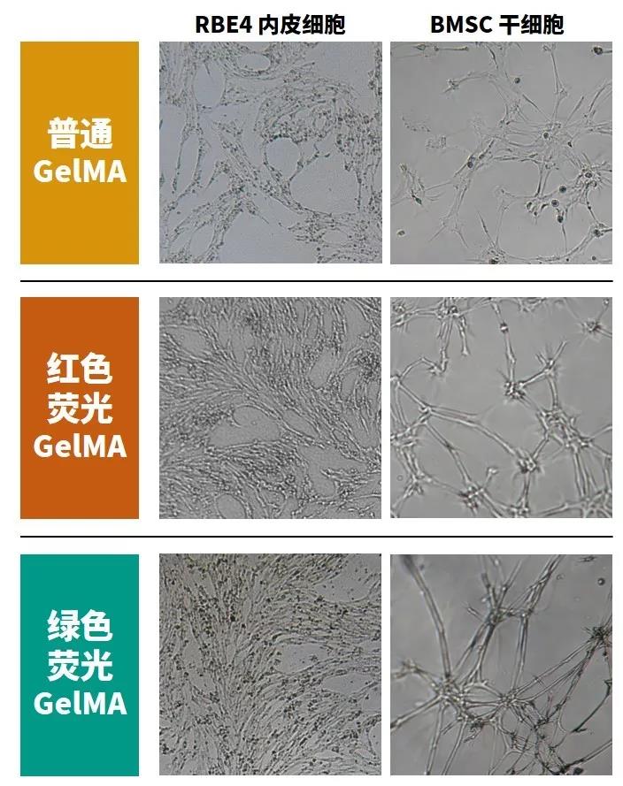3.熒光GelMA生物相容性優異。下圖為使用熒光GelMA和普通GelMA培養內皮細胞(RBE4)和骨干細胞(BMSC)第五天時的生長狀態,熒光GelMA與普通GelMA具有同等優異的生物相容性。