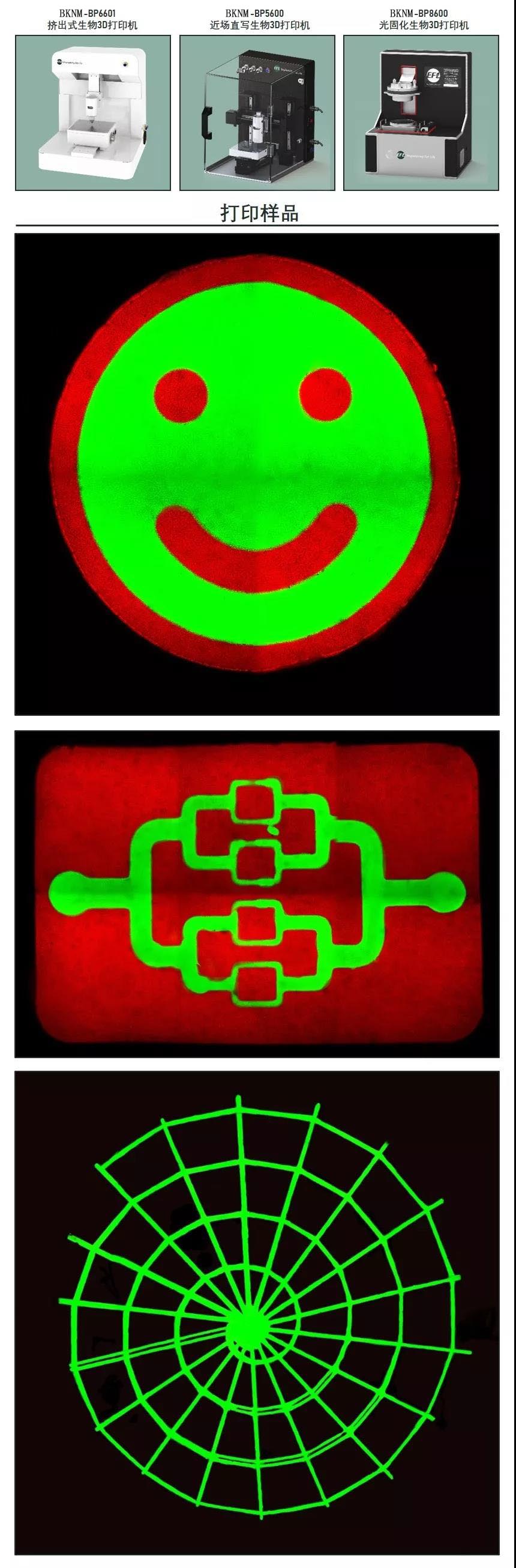 1.3D打印。近年來,GelMA已成為生物3D打印的明星墨水,熒光GelMA可使打印結構的表征更加清晰穩定。團隊研制的熒光GelMA可應用于全品類生物3D打印機,下圖為BKNM-BP系列生物3D打印機制造的熒光酷炫結構。