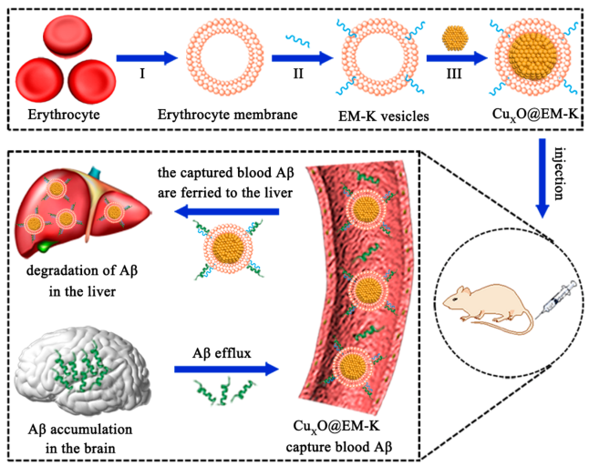 Composition: The erythrocyte membrane + A β targets the pentapeptide KLVFF + CuxO nanoenzyme