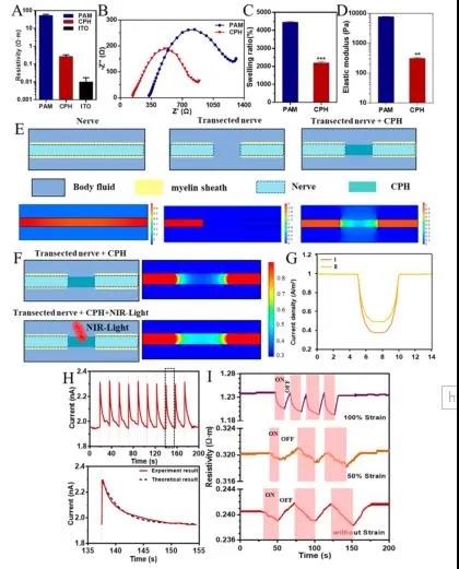 如圖3所示,CPH的電阻率(0.2 - 0.3Ω·米)遠(yuǎn)優(yōu)于PAM,這是由于聚苯胺的摻雜。電化學(xué)阻抗譜(EIS)檢測(cè)了CPH在PBS中的電活性。如圖3B所示,PAM和CPH的Nyquist圖在高頻區(qū)域呈準(zhǔn)半圓形,說明PAM和CPH都具有電荷轉(zhuǎn)移的能力。此外,還模擬了CPH在體內(nèi)替代受損神經(jīng)的可行性和生物電信號(hào)在神經(jīng)中的傳導(dǎo)。如圖3E所示,當(dāng)神經(jīng)完全受損時(shí),生物電信號(hào)無法傳輸。將受損神經(jīng)與CPH連接后,可恢復(fù)生物電信號(hào)傳輸功能。
