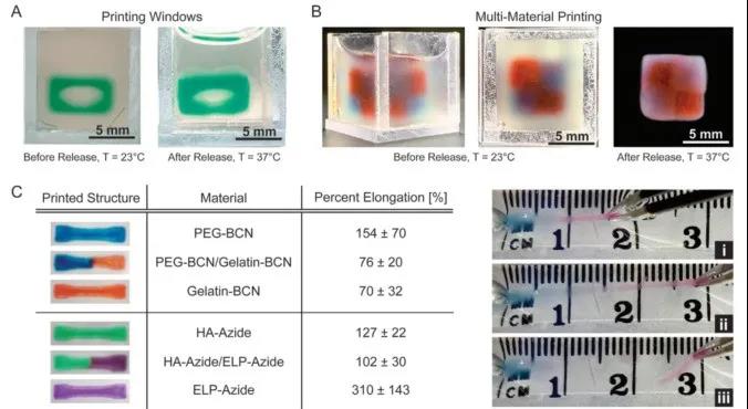 文章主要采用凝膠懸浮浴的方式進行打印,剪切變稀的凝膠支撐材料中混入了交聯(lián)劑,擠出噴頭伸入液面以下擠出的生物墨水構(gòu)建3D結(jié)構(gòu),同時交聯(lián)劑小分子就開始向生物墨水中擴散,并同時發(fā)生SPAAC反應(yīng),最后通過交聯(lián)固化,得到完整的三維實體水凝膠結(jié)構(gòu)。文章應(yīng)用該方法打印了窗口結(jié)構(gòu)、多材料方塊以及多材料拉伸結(jié)構(gòu)。