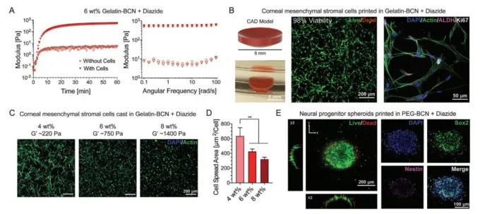 此外,通用生物墨水系統(tǒng)適應(yīng)性的關(guān)鍵是其定制能力,以匹配所需的生物打印應(yīng)用。故研究者還根據(jù)不同細胞種類的基質(zhì)力學(xué)性能構(gòu)建細胞培養(yǎng)的支架,驗證了角膜基質(zhì)細胞、神經(jīng)前體細胞等在生物墨水材料內(nèi)依然保持有良好的存活性和功能表達性。證明生物正交交聯(lián)生物墨水與其他生物分子沒有交叉反應(yīng),包括存在于細胞表面、培養(yǎng)基或墨水本身的生物分子,這使其成為一種通用策略。