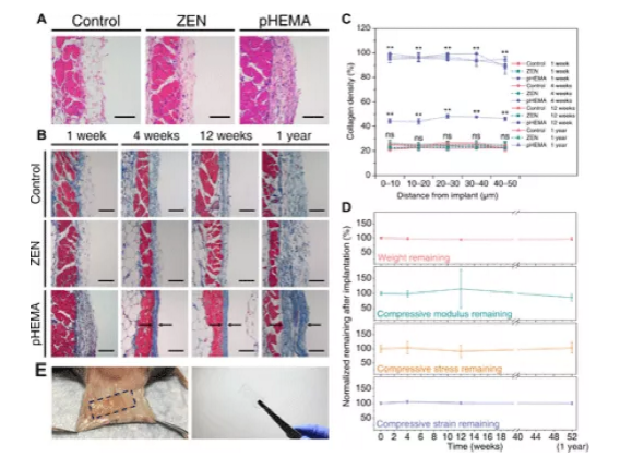 植入后一周,在與pHEMA水凝膠直接接觸的組織界面處觀察到嗜堿性變色和明顯的細胞蓄積,表明是急性炎癥反應(圖4A)。由于已知炎癥會觸發膠原分泌成纖維細胞的募集以封裝和分離異物,因此預計在1周后這些小鼠中會觀察到初始膠原層的形成(圖4,B和C)。到pHEMA水凝膠植入的第四周,已經形成了致密而成熟的膠原蛋白囊,該囊在1年后進一步增厚(圖4,B和C)。