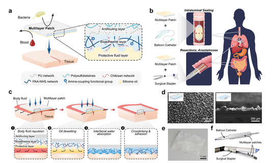 圖1 a)生物粘附貼劑的多層組成的示意圖。該貼劑包括帶紋理的生物粘合劑,在非粘合側(cè)融合了防污聚合物層,并在粘合側(cè)被疏水性流體層潤(rùn)濕,以排斥體液。b)通過氣囊導(dǎo)管對(duì)管狀器官和結(jié)構(gòu)進(jìn)行腔內(nèi)密封的多層貼片的示例性微創(chuàng)外科手術(shù)示例,以及在切除和吻合中用于線性密封的外科吻合器。c)多層貼劑的粘附機(jī)理示意圖。(1)當(dāng)將貼劑朝組織方向移動(dòng)時(shí),疏水性保護(hù)層排斥血液并防止污染生物粘附層。(2)施加超過77.5 kPa的壓力會(huì)導(dǎo)致油從生物粘附層中脫濕。(3)生物粘附層與組織表面接觸并立即吸收界面水,形成暫時(shí)的交聯(lián)。(4)在生物粘附層中的NHS酯官能團(tuán)之間形成共價(jià)鍵,以實(shí)現(xiàn)穩(wěn)定的長(zhǎng)期粘附。d)生物粘附層微織構(gòu)表面的頂視圖(左)和側(cè)視圖(右)的掃描電子顯微鏡圖像。e)組裝好的多層貼片的照片。f)裝載在球囊導(dǎo)管和手術(shù)吻合器上的多層貼劑。