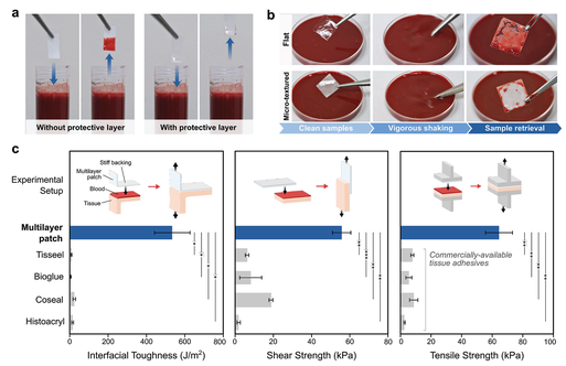 圖2 a)在豬血中浸沒之前和之后的帶有和不帶有疏水性液體層的多層貼片的照片。b)在豬血浴中劇烈搖動(dòng)前后,帶有平坦和微紋理生物粘附層的多層貼片的照片。包含微織構(gòu)生物粘附層的多層貼片表現(xiàn)出疏水性流體層更高的穩(wěn)定性和拒血能力。c)比較多層貼劑和各種可商購(gòu)的組織粘合劑的粘附性能,所述粘附劑粘附到涂有豬血的豬皮膚上。