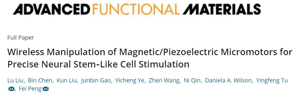 涂盈鋒教授團(tuán)隊(duì)與中山大學(xué)彭飛團(tuán)隊(duì)及荷蘭埃因霍芬理工大學(xué)的Jan van Hest團(tuán)隊(duì)展開(kāi)合作,設(shè)計(jì)出了一種基于金納米棒的多功能仿生納米體系。研究人員以順鉑與透明質(zhì)酸上的羧基之間的離子螯合作用為靈感,對(duì)金納米棒表面進(jìn)行巰基透明質(zhì)酸的改性,成功地在金納米棒表面交聯(lián)形成了凝膠載藥儲(chǔ)庫(kù),使得經(jīng)典抗癌藥物阿霉素與順鉑能夠同時(shí)實(shí)現(xiàn)負(fù)載。此外,為了達(dá)到更好的腫瘤靶向效果,該研究在納米載體表面包裹了腫瘤細(xì)胞膜,最終得到仿生納米體系。當(dāng)與同源及非同源腫瘤細(xì)胞共孵育時(shí),該仿生納米載體能夠選擇性地富集于同源腫瘤細(xì)胞內(nèi),表現(xiàn)出了優(yōu)異的腫瘤靶向能力。采用尾靜脈注射24小時(shí)后,載體實(shí)現(xiàn)了在小鼠移植瘤內(nèi)的大量富集。在近紅外激光的照射下,載體內(nèi)核的金納米棒可產(chǎn)生光熱效應(yīng),局部的熱能觸發(fā)了負(fù)載化療藥物的釋放,從而實(shí)現(xiàn)針對(duì)腫瘤的協(xié)同的光熱及化療。該研究論文的第一作者單位和最后通信作者單位均為南方醫(yī)科大學(xué)藥學(xué)院,其中論文第一作者為藥學(xué)院2018級(jí)碩士研究生高俊彬,末位通訊作者為涂盈鋒教授;中山大學(xué)彭飛教授及荷蘭埃因霍芬理工大學(xué)的Jan van Hest教授為共同通訊作者。研究得到了中組部海外青年項(xiàng)目、國(guó)家自然科學(xué)基金、廣東省自然科學(xué)基金以及珠江學(xué)者等項(xiàng)目的支持。另外,涂盈鋒教授團(tuán)隊(duì)在微納米馬達(dá)再生醫(yī)學(xué)領(lǐng)域取得了新的研究進(jìn)展。研究結(jié)果以“Wireless Manipulation of Magnetic/Piezoelectric Micromotors for Precise Neural Stem-Like Cell Stimulation(無(wú)線(xiàn)操縱磁控壓電微馬達(dá)精準(zhǔn)刺激類(lèi)神經(jīng)干細(xì)胞)”為題,在化學(xué)類(lèi)國(guó)際材料科學(xué)期刊Advanced Functional Materials (IF=15.621)在線(xiàn)發(fā)表。該工作是與中山大學(xué)相互合作的成果。藥學(xué)院涂盈鋒教授、中山大學(xué)材料科學(xué)與工程學(xué)院彭飛教授為本文共同通訊作者。南方醫(yī)科大學(xué)碩士研究生劉璐為本文的第一作者。該研究受到國(guó)家自然科學(xué)基金、廣東省青年珠江學(xué)者項(xiàng)目的支持。奈梅亨大學(xué)Daniela A. Wilson教授參與了本項(xiàng)研究,為論文的共同作者。