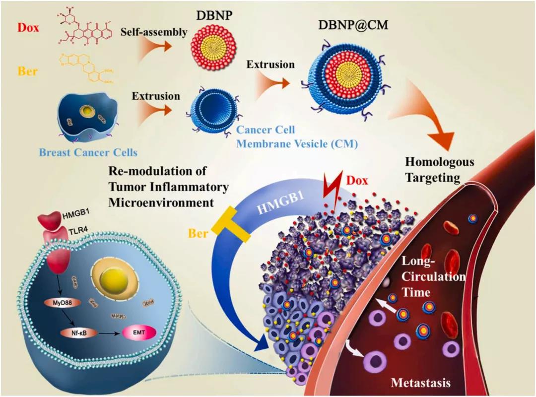(1)小檗堿(Ber)是一種經臨床批準的生物堿,已被證明是一種HMGB1-TLR4調節劑,會在體內外促進乳腺癌的轉移。首先,實驗假設聯合使用Dox和Ber對于乳腺癌的化療有益,并設計了由Dox和Ber組成的自組裝納米藥物(DBNP)。