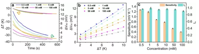 圖4 Tp Tag-COF/PAN在不同濃度的KCl水溶液(0.5~100 mM)中的熱響應(yīng)性能。【制備可穿戴溫度傳感器】基于這些結(jié)果,作者探索了Tp Tag-COF/PAN在設(shè)計(jì)具有熱感覺能力的可穿戴設(shè)備中的潛力。作為一個(gè)傳感器,膜被放置在浸入KCl溶液(1 mM)的碳布之間。通過(guò)簡(jiǎn)單加熱或冷卻一塊碳布來(lái)誘導(dǎo)溫度梯度,并使用上述方法進(jìn)行測(cè)量。由此產(chǎn)生的電位變化由Ag/AgCl電極檢測(cè)。當(dāng)系統(tǒng)恢復(fù)熱平衡后,施加另一個(gè)溫度梯度來(lái)檢測(cè)動(dòng)態(tài)電位變化。圖5顯示了熱感覺系統(tǒng)的實(shí)時(shí)輸出電位響應(yīng),證明了其靈敏度和重復(fù)性。此外,輸出電位響應(yīng)不同溫度梯度的變化幅度也有明顯差異?偟膩(lái)說(shuō),所開發(fā)的熱感覺系統(tǒng)在可穿戴溫度傳感器的設(shè)計(jì)上顯示出巨大的應(yīng)用潛力。