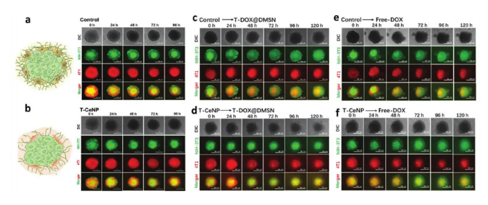 氧化鈰納米粒子(CeNPs)的仿生酶活性主要傾向于超小粒徑和裸露的表面。不幸的是,這兩個特點不利于其在體內的應用,因為容易聚集和快速腎臟過濾。為了充分利用CeNP的抗癌活性,美國南卡羅萊納大學Peisheng Xu等人開發了一種同源靶向氧化鈰納米顆粒系統--靶向CeNP (T - CeNP),該系統整合了生物可降解的樹枝狀介孔二氧化硅納米顆粒、類超氧化物歧化酶和過氧化氫酶的CeNP,以及癌細胞膜的偽裝涂層。