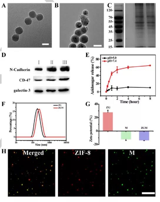 本文要點:(1)該仿生平臺具有豐富的受體,不僅可以選擇性地靶向同型細胞,還可以實現對不同乳腺癌亞型的選擇性MGL。此外,具有內溶酶體逃逸性能的ZIF-8可使得疊氮糖從溶酶體中逃逸并加速其代謝整合。