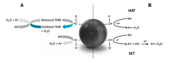 圖4. 利用酶催化原子轉移自由基聚合制備MPGs凝膠和用于熒光成像示意圖。5、鉑納米酶用于測定唾液中總抗氧化劑水平[5]氧化還原失衡和氧化應激相關的生物標記物在人類疾病扮演著重要的作用,總體抗氧化能力(TAC)是一項重要的生理參數,然而抗氧化測試需要復雜的儀器裝置與步驟,并且它們的準確性和敏感性存在有待優化的地方。近期意大利技術研究所Pier Paolo Pompa研究團隊將鉑納米酶和羥基自由基探針相結合,利用在納米酶表面的羥基自由基與TMB顯色底物、抗氧劑AH之間的競爭反應,通過單電子轉移(SET)和氫原子轉移(HAT)反應幾乎可以對所有的生理抗氧化物種進行檢測。納米酶與唾液混合5分鐘之后通過比色反應進行測試,實現肉眼或手機快速、準確的檢測觀察。此方法為檢測抗氧化能力開創了新方法,具有高效、便捷、范圍廣和準確等優勢,具有極大的實際應用前景。