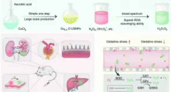 圖5. 鉑納米酶用于檢測抗氧化能力的原理示意圖。6、超小銅基納米酶用于活性氧清除[6]氧化應激反應與許多急性和慢性炎癥疾病有關,但目前臨床上治療方法有限。具有良好活性氧清除能力和生物相容性的酶模擬納米材料的開發是治療活性氧相關炎癥的一條有效途徑。浙江大學毛崢偉研究團隊報道了一種簡單且有效的一步法開發超小Cu5.4O納米顆粒,它同時具有多重模擬酶活性和廣譜清除ROS的能力,可用于治療ROS相關疾病。Cu5.4O納米酶同時具有過氧化氫酶、超氧化物歧化酶和類谷胱甘肽過氧化物酶的特性,在極低劑量下對ROS介導的損傷表現出細胞保護作用,顯著改善急性腎損傷、急性肝損傷和傷口愈合的治療效果。同時,Cu5.4O納米酶超小尺寸使其在腎臟內快速清除,保證了生物相容性。Cu5.4O納米酶的保護作用和良好的生物相容性將促進ROS相關疾病的臨床治療和下一代納米酶的開發。