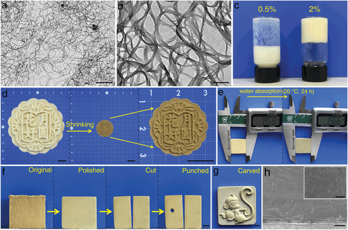 圖2 PANF、PANF水凝膠和PANF塊體的特征。a,b) PANF 在不同放大倍數下的透射電子顯微鏡 (TEM) 圖像;比例尺:(a)和(b)分別為 2 μm 和 200 nm。c)具有不同PANF濃度的PANF分散體/PANF水凝膠的宏觀狀態。d) 原始月餅形狀的PANF水凝膠和水凝膠干燥收縮后得到的致密化PANF塊體;比例尺:10 毫米。月餅上寫著“花開月圓。e) 吸水(20°C,24 小時)后PANF 本體的尺寸變化。f) PANF 塊體的典型后處理方法(拋光、切割和沖壓);比例尺:4 毫米。g) 雕刻PANF散裝(掛飾);比例尺:4 毫米。h)PANF塊體在不同放大倍數下的掃描電子顯微鏡(SEM)圖像;比例尺:(h) 和插圖分別為 5 μm 和 100 nm。