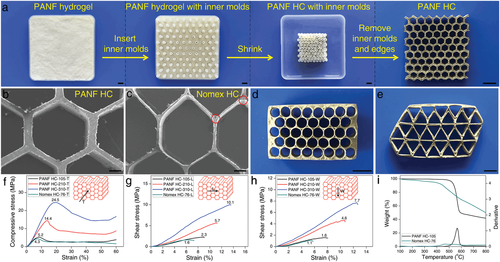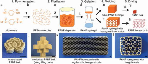 示意圖1 全PPTA材料及典型產品制造工藝(MNM法)示意圖。a) PPTA 的聚合式。b) PPTA 分子。c) 分散體中制備的 PANF。d) 通過過濾從 PANF 分散體中獲得的 PANF 水凝膠。e) 立方 PANF 水凝膠。f) 以正六邊形尼龍柱為內模的 PANF 水凝膠。g) (e) 中水凝膠干燥后的 PANF 本體。h) 在 (f) 中的水凝膠干燥后,具有規則正六邊形細胞的 PANF HC。i)蓮花形PANF散裝。j) 由加工過的 PANF 散裝料組裝而成的互鎖“孔明鎖”。k) 具有規則正六邊形細胞的 PANF HC。l) 具有不規則細胞的PANF HC。(i)–(l) 中的比例尺為 5 mm。