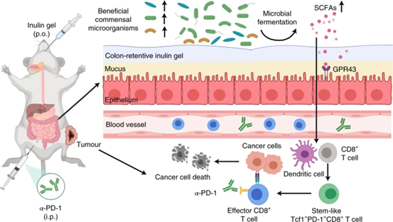 圖 1:使用結腸滯留菊粉凝膠原位調節腸道微生物群以改善癌癥免疫治療。