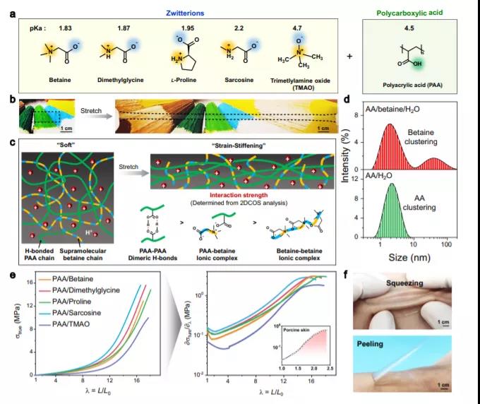 近日,東華大學武培怡教授,孫勝童研究員報道了通過在氫鍵交聯(lián)的聚羧酸鏈網(wǎng)絡中引入熵驅(qū)動的超分子兩性離子網(wǎng)絡,設計并制備了一系列具有高彈性、透明、自愈和應變硬化的質(zhì)子導電離子皮膚。