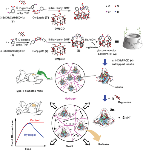 雙齒 β-CD 通過三個簡單的反應很容易合成,從 DMβCD 和對(溴甲基)苯基硼酸開始。雙齒β-CD的形成過程被發(fā)現(xiàn)是尺寸選擇性的,因為從間(溴甲基)苯基硼酸試劑中,不能提供雙齒β-CD衍生物。雙齒 β-CD(即 4-CH2PACD)包含葡萄糖狹縫,并顯示出與 D-葡萄糖的高效特異性結(jié)合。合成的 4-CH2PACD 被摻雜到 PAAm 水凝膠中,賦予水凝膠對 D-葡萄糖的特異性反應。具體而言,當凝膠在 D-葡萄糖溶液中平衡時,水凝膠的膨脹是可見的,而在 D-葡萄糖異構體(如 D-果糖和 D-半乳糖)溶液中則收縮。發(fā)現(xiàn)這種特征有利于自我調(diào)節(jié)的特定葡萄糖響應性胰島素釋放,因為溶液中高濃度的 D-葡萄糖會導致凝膠膨脹并增加網(wǎng)格尺寸。體內(nèi)試驗表明,在 T1DM 中預加載雙齒 β-CD 和短活性胰島素的 PAAm 水凝膠能夠?qū)崿F(xiàn)長期持續(xù)的血糖控制。預計這種簡便的合成方法將為雙齒 β-CD 作為各種重要生物化合物或代謝物的受體的合成打開一扇新的大門。考慮到 β-CD 與許多生物或藥物活性化合物之間的多功能主客體內(nèi)含物,以及雙齒 β-CD 與靶向生物分子之間的特定相互作用,為 DSGTIR 開發(fā)了一種新機制。