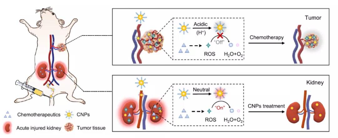 鑒于此,浙江大學(xué)凌代舜課題組在《Nature Communication》上發(fā)表了Catalytic activity tunable ceria nanoparticles prevent chemotherapy-induced acute kidney injury without interference with chemotherapeutics為題的研究,該研究設(shè)計(jì)了一種催化活性可調(diào)的二氧化鈰納米粒子(CNPs),可以防止化療引起的 AKI,但不會干擾化療作用。具體來說,在腎皮層中性環(huán)境中CNP催化分解H2O2,然后通過激活Nrf2/Keap1信號通路來調(diào)節(jié)與ROS有關(guān)的基因表達(dá),恢復(fù)ROS平衡保護(hù)腎小管;在腫瘤酸性微環(huán)境下,CNP由于高濃度的H+破壞了其活性催化位點(diǎn)進(jìn)而限制其的抗氧化作用,從而不干擾化療生成的ROS來殺死癌細(xì)胞。作為 ROS調(diào)節(jié)劑,CNP這種條件依賴型可調(diào)的催化活性,在癌癥患者的 AKI 臨床預(yù)防和治療方面具有巨大潛力。