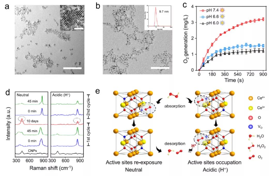 圖1(a)氯仿中超微CNPs的TEM圖像;(b)經(jīng)DSPE-PEG修飾后的CNPs水相中TEM圖像,其中內(nèi)插圖DLS數(shù)據(jù)表明DSPE-PEG水合直徑分布為9.7nm;(c)CNPs在不同pH下分解H2O2的O2產(chǎn)生量;(d)在中性和酸性pH,CNPs與H2O2反應(yīng)下其不用時(shí)間的拉曼光譜;(e)CNPs pH環(huán)境依賴性表現(xiàn)出的類過氧化氫酶活性差異的化學(xué)模型示意圖。