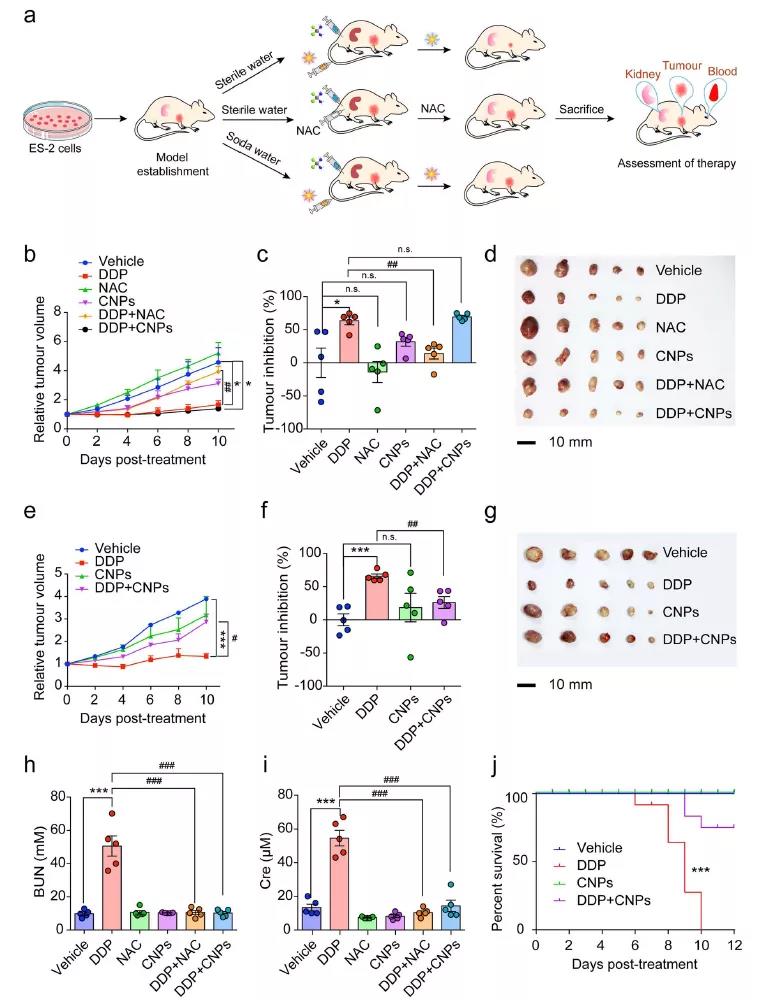 圖6 (a) ES-2皮下瘤小鼠治療方式與評估示意圖;(b-g)不同處理的腫瘤體積、抑制效率和實(shí)體腫瘤大小;(h, i)不同處理下小鼠的BUN和Cre的水平以及(j)不同處理下小鼠的存活率。