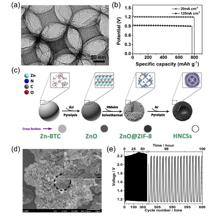 圖1. (a, b) MOF衍生富氮碳晶體(BHPC-950)的透射電鏡圖像和鋅-空氣電池比電容圖;(c) 通過原位生長和煅燒策略制備摻氮空心碳球的原理圖;(d, e) BNPC-1100的掃描電鏡圖像和使用BNPC-1100作為空氣陰極的可充電鋅-空氣電池的循環性能圖。