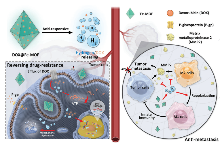 (圖1 從DOX@Fe-MOF納米晶體中釋放酸反應性氫/藥物以克服癌癥耐藥/轉移的示意圖)