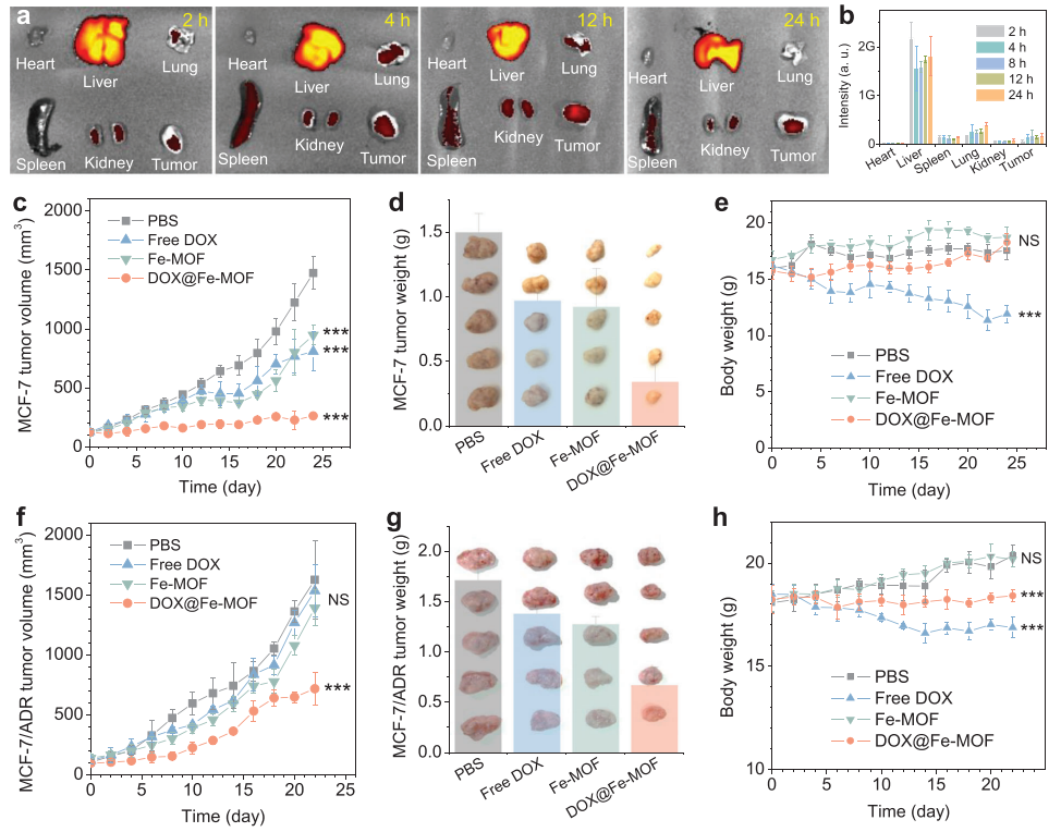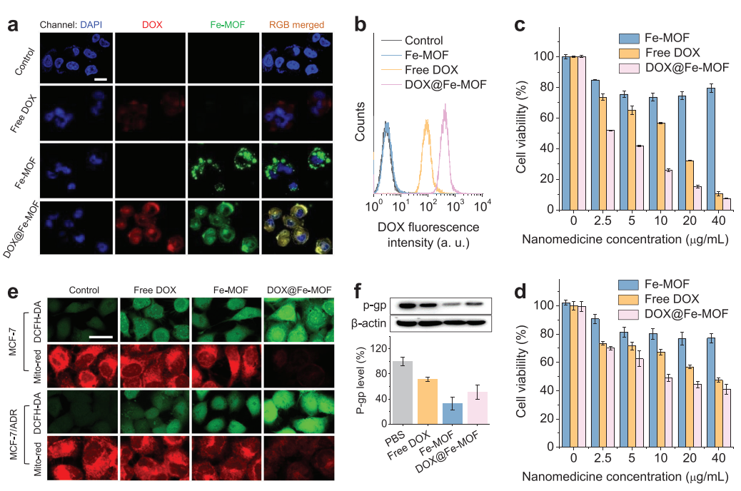 開發既能控制藥物釋放又具有高生物安全性的刺激響應性可降解多孔載體對其臨床轉化至關重要,但目前仍具有挑戰性。本文通過卟啉與零價鐵原子的配位,設計了一種新型的卟啉-鐵金屬有機骨架(Fe-MOF)納米晶體,作為酸降解的藥物載體和氫供體。Fe-MOF納米晶體表現出優異的酸響應降解能力,可以產生氫氣并同時釋放負載藥物,用于癌癥多藥耐藥(MDR)和轉移的氫聯合化療,以及局部氫消除藥物對正常細胞/組織的脫靶毒副作用。在機制上,釋放的H2通過免疫激活瘤內M1表型巨噬細胞,從而下調轉移相關基質金屬蛋白酶-2 (MMP-2)的表達,幫助化療藥物有效抑制腫瘤轉移,并下調MDR癌細胞中p -糖蛋白(P-gp)蛋白和三磷酸腺苷(ATP)的表達,使化療藥物增敏,增強對線粒體和DNA的損傷。高抗MDR/抗轉移性和高生物相容性使Fe-MOF納米晶體和基于Fe-MOF的納米藥物具有很高的臨床轉化潛力。