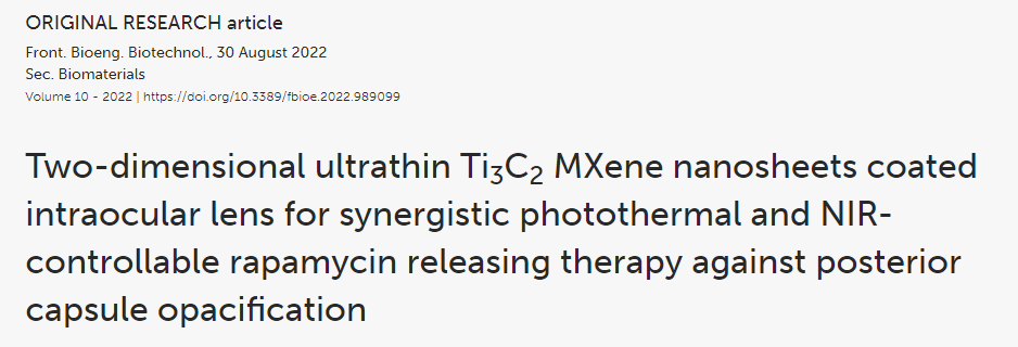 后囊膜混濁(PCO)是白內(nèi)障術(shù)后最常見(jiàn)的遲發(fā)性并發(fā)癥之一。設(shè)計(jì)了多種藥物洗脫人工晶狀體(IOL),以實(shí)現(xiàn)藥物的持續(xù)釋放,抑制白內(nèi)障術(shù)后眼部炎癥、晶狀體上皮細(xì)胞(LECs)的增殖和后發(fā)性白內(nèi)障的發(fā)生。盡管在該領(lǐng)域已有進(jìn)展,但載藥IOL存在眼毒性、載藥能力不足、釋放時(shí)間短等問(wèn)題。為了防止PCO的發(fā)生并解決這些問(wèn)題,本研究采用兩步自旋涂層法,由二維超薄Ti3C2 MXene納米片和雷帕霉素(Rapa)制備了一種新型載藥IOL (Rapa@Ti3C2-IOL)。Ti3C2作為Rapa的給藥庫(kù)。Rapa@Ti3C2-IOL具有光熱和近紅外(NIR)可控的協(xié)同釋藥特性。結(jié)果表明,Rapa@Ti3C2-IOL具有制備簡(jiǎn)單、透光率高、光熱轉(zhuǎn)化能力優(yōu)異、NIR可控的釋藥行為等優(yōu)點(diǎn)。在溫和的808 nm近紅外激光(1.0 W/cm−2)照射下,Rapa@Ti3C2涂層有效地消除了Rapa@Ti3C2-IOL周圍的LECs。此外,NIR可控的Rapa釋放抑制了LEC的遷移,抑制了體外光熱治療后的炎癥反應(yīng)。然后將Rapa@Ti3C2-IOL植入鼠兔眼內(nèi),觀察4周后預(yù)防PCO的有效性和生物相容性。在近紅外照射下,Rapa@ Ti3C2-IOL植入物具有良好的PCO預(yù)防能力,對(duì)周圍健康組織無(wú)明顯病理?yè)p傷。本研究提供了一種具有協(xié)同光熱和NIR可控的超薄Ti3C2 MXene納米片IOL來(lái)預(yù)防PCO的有希望的策略Rapa釋放屬性。
