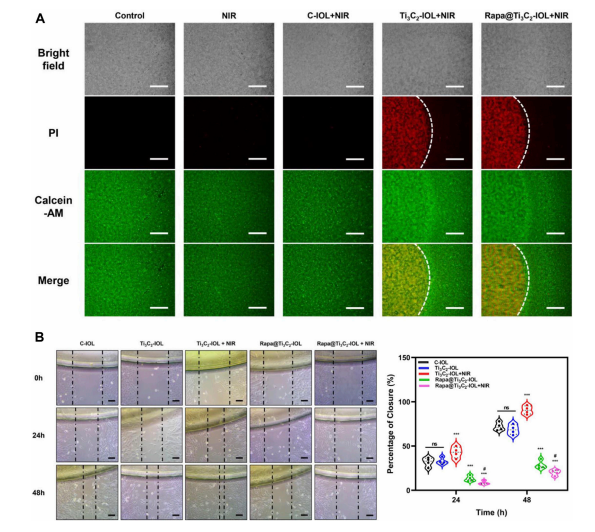 在這里,將Rapa@Ti3C2涂在IOL的光學(xué)部分表面,即Rapa@Ti3C2-IOL上,用于聯(lián)合PTT和NIR可控藥物釋放療法預(yù)防PCO。該Rapa@Ti3C2-IOL體系具有與商業(yè)疏水IOL較高的透光率、中等折射率和相當(dāng)?shù)膽?yīng)變應(yīng)力和拉伸特性。由于Ti3C2的高光熱轉(zhuǎn)換效率,Rapa在808 nm NIR照射下實(shí)現(xiàn)了Rapa的可控釋放行為。NIR觸發(fā)的Rapa釋放有利于抑制光熱治療后LECs的遷移,抑制炎癥反應(yīng)。Rapa@Ti3C2-IOL的協(xié)同治療研究表明,在體內(nèi)外均具有良好的LECs殺傷能力和PCO預(yù)防能力。此外,Rapa@Ti3C2- IOL對(duì)其他眼內(nèi)組織的毒性可以忽略不計(jì),這使得它有望在臨床轉(zhuǎn)化中得到應(yīng)用。這種具有優(yōu)異的治療效率和高生物相容性的Rapa@Ti3C2-IOL納米系統(tǒng)可能作為一種很有前途的預(yù)防PCO的策略。