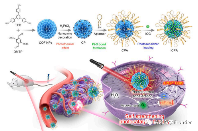 共價有機框架(COF)已成為納米醫學的一個有前景的平臺,但由于缺乏有效的 COF 修飾策略,開發多功能 COF 納米平臺仍然具有挑戰性。在此,本文提出了一種用于COF功能化的納米酶橋接(NZB)策略。作為過氧化氫酶模擬物的鉑納米顆粒(Pt NPs)原位生長在COF NPs的表面上,而不降低其載藥能力(CP),并且硫醇封端的適體通過穩定的Pt-S鍵進一步致密地裝飾到CP NPs上 (CPA)。Pt納米酶工程和適體功能化使納米平臺具有優異的光熱轉換、腫瘤靶向和過氧化氫酶樣催化性能。使用臨床批準的光敏劑吲哚菁綠(ICG)作為模型藥物,制造了用于腫瘤靶向自強化治療的納米系統(ICPA)。ICPA能夠有效地積聚到腫瘤組織中,通過分解過度表達的H2O2并產生O2來緩解缺氧微環境。在單波長近紅外光照射下,ICPA的類過氧化氫酶催化和單線態氧生成活性顯著增強,從而以自我強化的方式對惡性細胞和荷瘤小鼠產生良好的光催化治療效果。