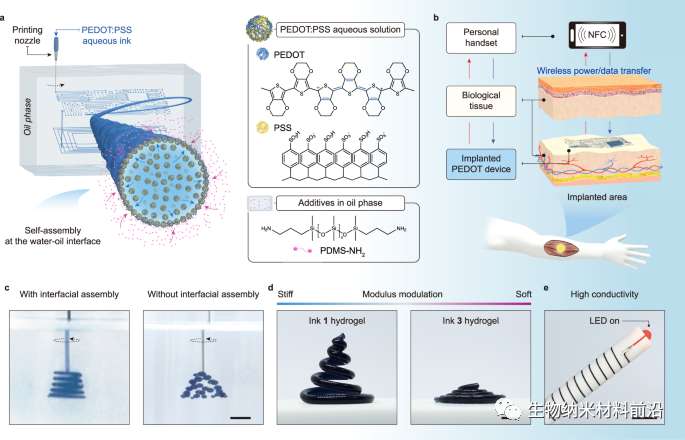 導電水凝膠需要可調節的機械性能、高電導率和復雜的 3D 結構,才能在(生物)應用中實現高級功能。在這里,本文設計了一種簡單的策略,通過可編程打印油內富含聚(3,4-乙撐二氧噻吩):聚(苯乙烯磺酸)(PEDOT:PSS)的水性墨水來構建3D導電水凝膠。在這種液包液印刷方法中,來自水相的PEDOT:PSS膠體顆粒和來自另一相的聚二甲基硅氧烷表面活性劑的組裝體在液-液界面形成彈性膜,從而將水凝膠前體油墨捕獲在設計的3D非平衡形狀中,以便隨后凝膠化和/或化學交聯。在兩個互穿水凝膠網絡中,當 PEDOT:PSS 含量低至 9mgmL−1 時,電導率高達 301 S m−1。輕松的可印刷性使我們能夠調整水凝膠的成分和機械性能,從而促進這些導電水凝膠作為電微流體設備的使用,并在未來定制近場通信(NFC)植入式生物芯片。