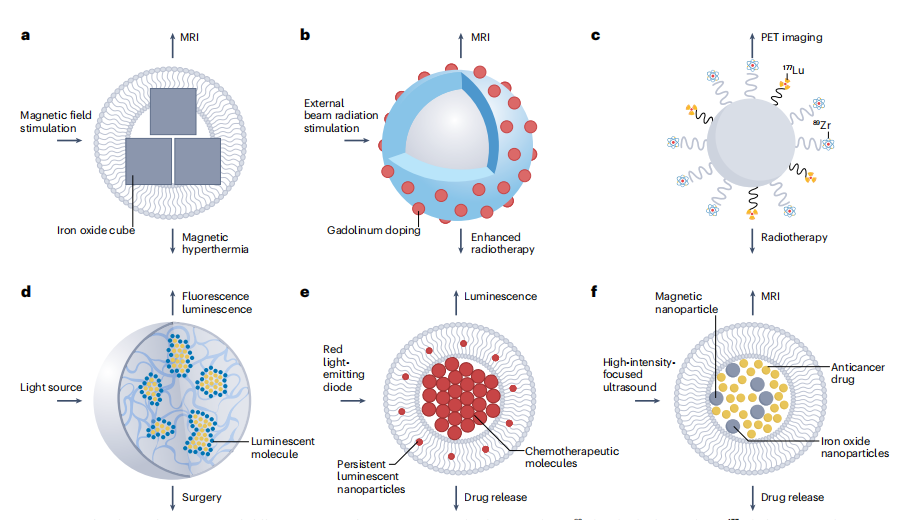 圖2|具有不同成像、治療和靶向成分的納米診療藥物的例子