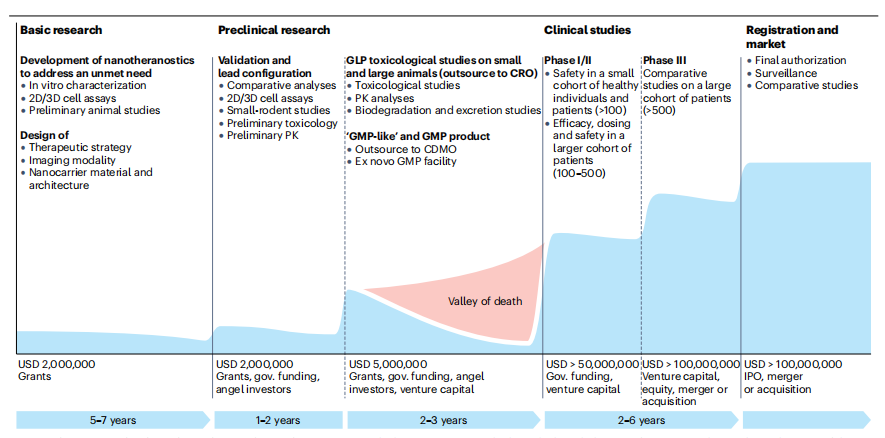 本文首先討論“構(gòu)建”納米治療的許多方法中的一些,重點(diǎn)是不同的成像方式和治療策略。然后概述了目前使用的納米治療在人類臨床發(fā)展的不同階段,鑒定具體的優(yōu)勢和機(jī)會(huì)。最后,我們定義關(guān)鍵步驟沿著臨床前和臨床發(fā)展的曲折道路提出解決技術(shù)、生產(chǎn)、法規(guī)問題的建議以及安全有效的納米治療臨床轉(zhuǎn)化的經(jīng)濟(jì)挑戰(zhàn)。