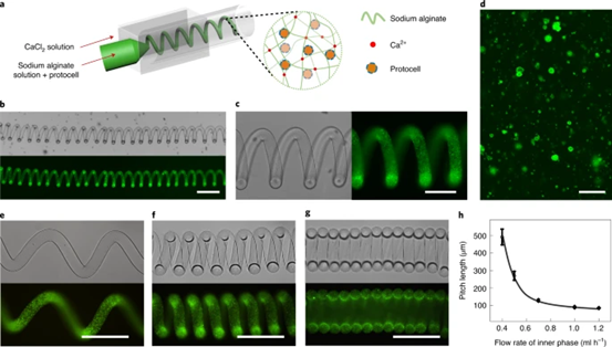 Fig. 1: microfluidic preparation of spiral hydrogel threads embedded in primordial cells.